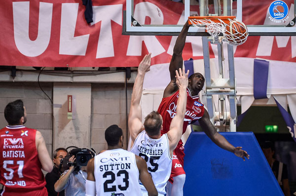 Nonostante un buon avvio di gara, un Davide Pascolo monumentale e 5 giocatori in doppia cifra, la Dolomiti Energia Trentino deve arrendersi per 86-74 alla corazzata EA7 Milano in gara 1 dei quarti di finale play-off. Trascinata da un Rakim Sanders (21 e 6 rimbalzi) tornato ai livelli del giocatore che dominA? la post season dell’anno passato, e con un Batista che con la sua potenza e il suo post basso (16) dimostra di poter condizionare da solo una serie, la squadra allenata da Jasmin Repesa rimedia infatti a un balbettante primo periodo vincendo con buona sicurezza una partita in cui Trento ha dato la sensazione di potersela giocare davvero solo per 30 minuti.
