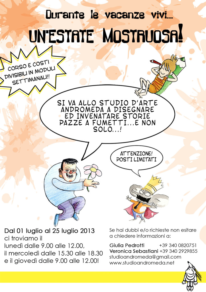 Ricordiamo inoltre che l’associazione propone per il mese di luglio unA�Laboratorio CreativoA�dal nomeA�“Un’estate mostruosa”A�che si rivolge ai bambini delle elementari e delle medie. Tale iniziativa ha come scopo quella di sollecitare la creativitA� dei piccoli partecipanti, sviluppandola e orientandola attraverso il canale del fumetto.