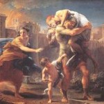 Enea, figlio di Anchise e della dea Afrodite, scappa da Troia incendiata portando a spalla il padre, tenendo per mano il figlio Ascanio