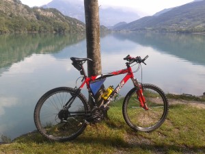 Il Lago di Cavedine (vista verso Nord, foto di Enrico Perasso, bici di Edoardo Pellegrini, borraccia FIAB)