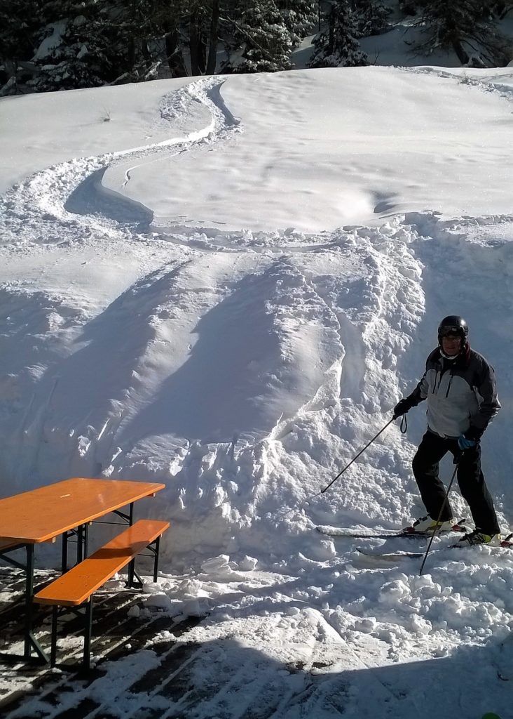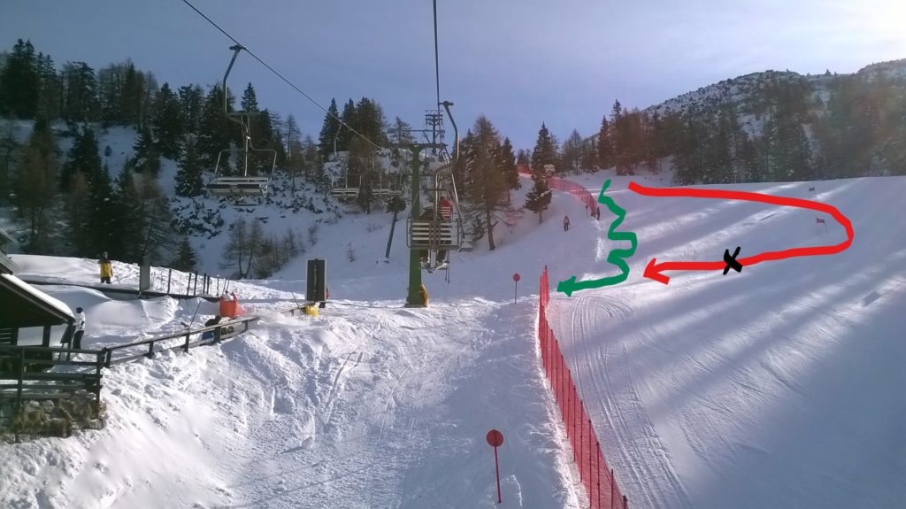 Usualmente seguo il percorso 1 (verde) nella foto qui sopra. Questa volta ho scelto il percorso 2 (rosso) e mentre ero su una rotta rettilinea, sci uniti e paralleli (sci modello Salomon Race, m 1,70 – r 16), posso solo presumere di avere appena appena spigolato con la lamina esterna dello sci a valle (i miei sci sono molto permalosi: reagiscono subito!) e nel punto contrassegnato dalla X nera … bum! Omero e trochite, 35 giorni di fasciatura poi riabilitazione.