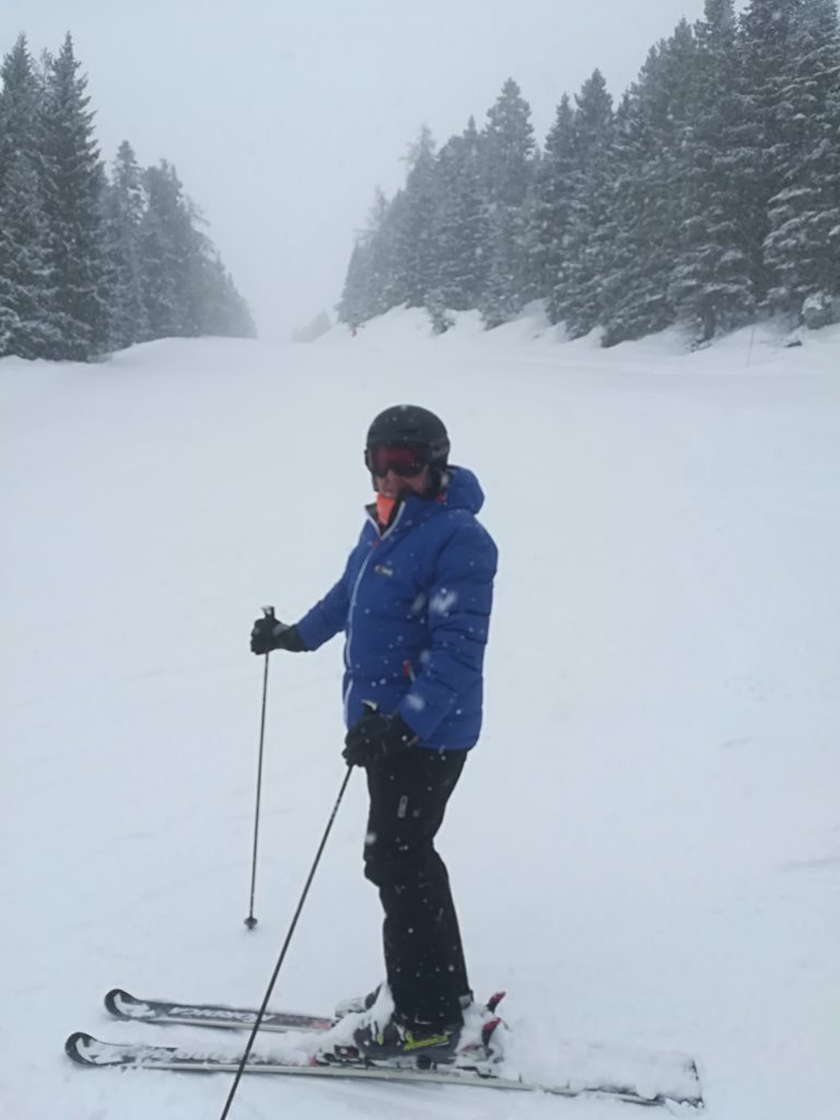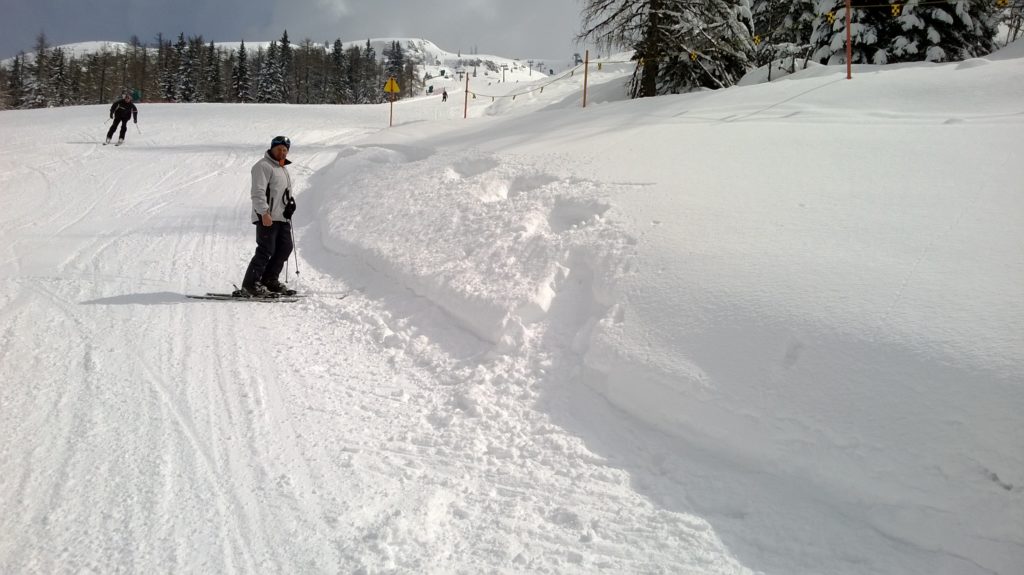 E siamo andati e … audentes Fortuna iuvat, nel senso che nelle piste medio basse, fra i 1000 e i 1700 metri di quota non c’era nebbia; la nevicata non disturbava più di tanto; temperatura perfetta, pochi gradi sotto zero; gente pochissima; neve fa-vo-lo-sa, ovvero un palmo di farina fresca su una pista battuta! Stiamo morbidi, senza spigolare: gli sci frusciano sulla neve, lasciamo che la accarezzino. Curve dolci, ma si riesce anche a fare lo scodinzolo, molto meglio fino a quando si calca neve immacolata, senza tracce precedenti.