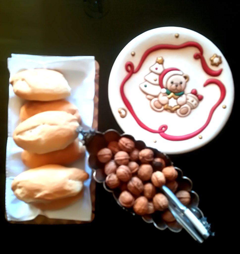 Pan e nos l’è en magnar da spos, pane e noci è un mangiare da sposi. Il primo significato, quello di base, era che di ‘sti ani (tanti anni fa) già potersi concedere pane e noci era una rarità, nel senso che in questo caso finalmente ci si sfamava e alimentava abbondantemente e con gusto. Il secondo significato era che questo menu rappresentava una delle portate importanti in un (allora povero) pranzo di nozze. Il terzo significato, un po’ malizioso: che lo sposo, così alimentato, sarebbe stato più gagliardo. Nella foto io ho voluto raffrontare l’ieri all’oggi, aggiungendo un piatto di Thun, una sciccheria moderna, a sottolineare il contrasto, il cambiamento dei tempi, per invitare me stesso a non perdere di vista ciò che conta maggiormente: l’essenziale che, come ci insegna il Piccolo Principe, è invisibile agli occhi.