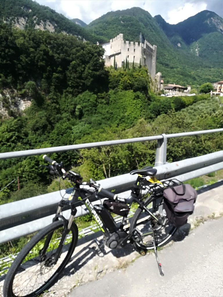 Scendo velocementee dalla parte opposta, la “strada vecchia” per intendersi, quella che passa da Ville del Monte. Superato il Castello di Tenno di soli 100 metri, prendo la piccola deviazione a sinistra: quella che era la vera strada vecchia, oggi una semiciclopedonale aperta anche alle auto (una alla volta per ogni senso di marcia sennò non si passa!). E’ una strada di costa, grosso modo un falsopiano che conduce quasi sulla verticale di Arco, per poi rientrare verso sud e collegarsi a Volta di No sulla SP (ex SS 421) che sale da Riva (in questa località si diparte, a sinistra per chi scende, la diramazione ciclabile diretta per Arco, veramente molto ripida: si raccomanda di avere il paracadute a bordo!)