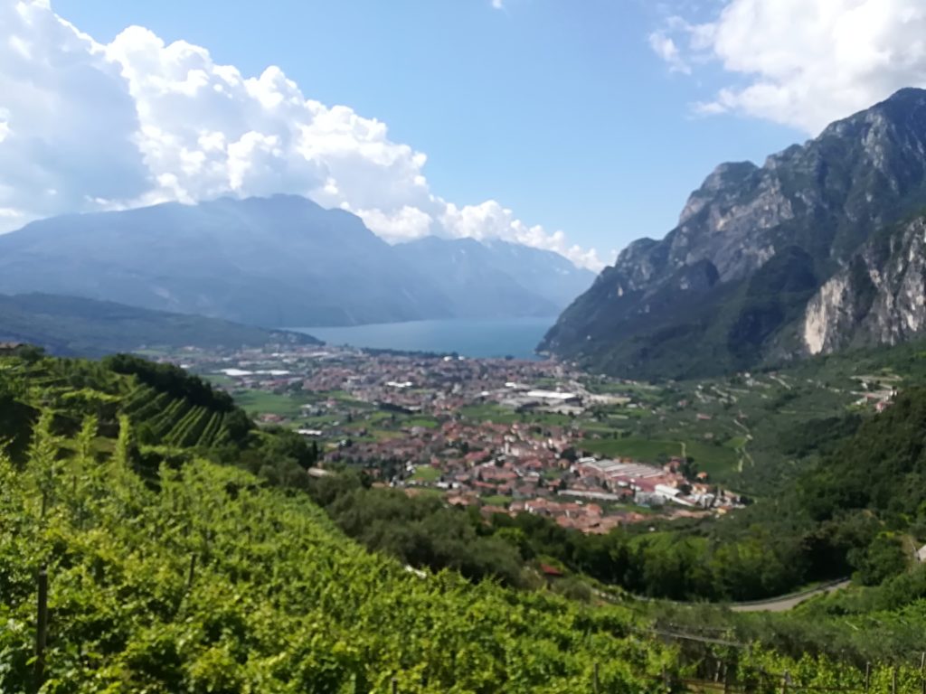 Durante la “traversata” mi fermo e scatto qualche foto. Una in particolare mi è riuscita significativa: la voglio chiamare “Le dolci linee curve”: 1) la prima, quella dei vigneti e del boschetto che si adagia da sinistra in alto a destra in basso verso la base della montagna; 2) la seconda linea, parallela alla prima, con la quale delimita le costruzioni della frazione di Varone e della città di Riva del Garda; 3) quella della montagna che da destra va a tuffarsi nel lago in località Sperone; 4) quella del profilo della catena del Baldo che resta immobile a sostenere i “baloni de l’Ora” cioè i bei nuvoloni bianchi a indicare che si è levata una bell’Ora. 5) Infine, proprio la linea di questi nuvoloni che pare vogliano anch’essi andarsi a tuffare nel lago, molto più a sud, convergendo con il profilo degradante del Baldo.