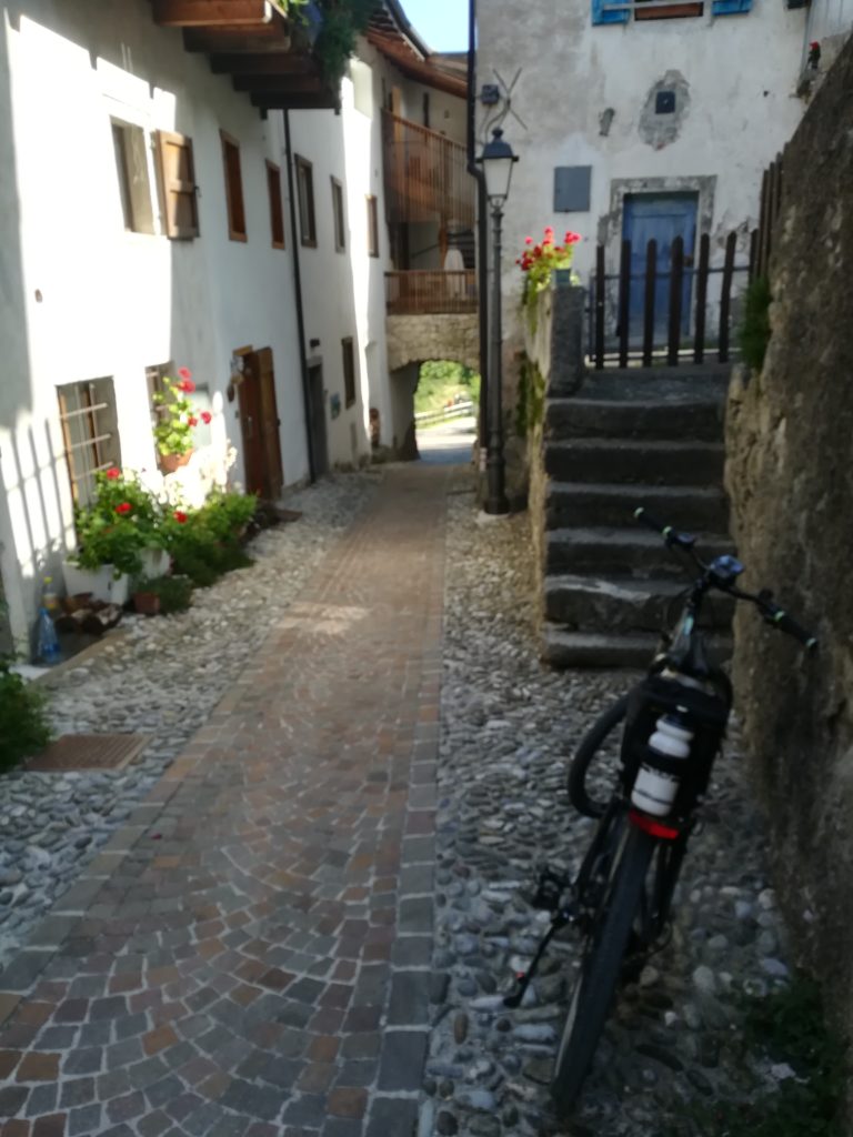 Ma veniamo all’oggi: ho deciso, sarà una giornata “in salita”, quindi prendo la e-bike, una mountain bike con motore Bosh e batteria da 400. Sono le 07,00. Per non farmi mancare nulla, percorro il lungolago per 3 km da Riva fino al fiume Sarca senza aiuto elettrico. Indi giro a nord e sempre su pista ciclabile raggiungo Arco che supero agevolmente grazie al nuovo raccordo ciclabile. Tutta pianura, pochissimi ciclisti, qualche maratoneta in allenamento. In questi 5 km utilizzo il primo livello di aiuto elettrico denominato “eco”: infatti la bici pesa 25 km ed ho un forte vento contrario da nord. Subito a nord di Arco, la rotonda dalla quale si diparte alla mia destra la circonvallazione della città. La supero in direzione nord e dopo 100 metri volto a destra in leggera salita per 300 metri in Via Angelo Maino in direzione Massone, che però non raggiungo perché ben prima volto a sinistra e attraverso la bellissima miniatura della frazione S. Martino. Dopo 200 metri … è finita la vacanza, amici: si volta a destra in salita (15-18%!), si lascia sulla destra il minuscolo bivio per la chiesetta di S. Martino e via, salir sempre salir si arriva alla Falesia Policromuro, un’affascinante palestra di roccia. La strada è asfaltata, stretta, percorsa da rarissime auto (quelle degli abitanti dell’altrettanto rarissime case che si trovano lungo il percorso). La pendenza è da omeni veri ma per fortuna ho l’aiuto elettrico che mi concedo al secondo-terzo livello (tour – sport: evito di utilizzare l’ultimo, il turbo).