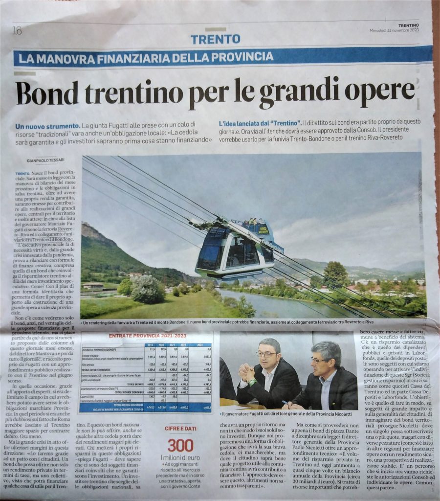 Dal quotidiano “Trentino” odierno a pag. 16 apprendo che la Provincia Autonoma di Trento sta progettando di emettere BOP-Buoni Ordinari Provinciali per cofinanziare il progetto Funivia Trento-Monte Bondone e la ferrovia Rovereto-Riva del Garda.
