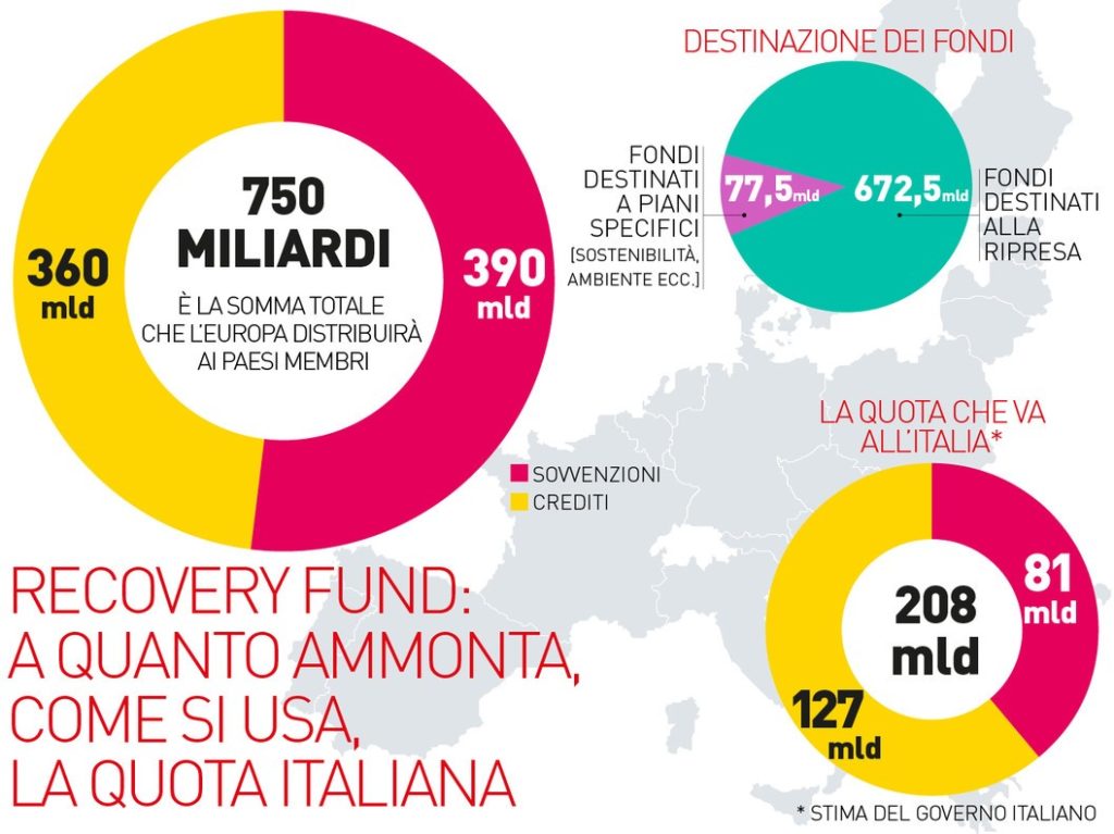Il Recovery Fund (Next generation UE) consiste in fondi erogati dall’UE per la ripresa economica dei paesi. Il pacchetto complessivo è fatto di due parti: quello composto dal bilancio pluriennale UE dal 2021 al 2027 e quello del Recovery Fund vero e proprio. Secondo il progetto complessivo, il bilancio UE dovrà avere nei sette anni un volume pari a 1.074 miliardi di euro, da finanziare prevalentemente attraverso i contributi netti degli Stati membri dell’Unione. Il piano per la ripresa economica invece è pari a 750 miliardi di euro, di cui 390 miliardi verranno erogati sotto forma di sovvenzioni (che quindi non dovranno essere rimborsate dai Paesi destinatari) mentre 360 miliardi di euro verranno distribuiti sotto forma di crediti.