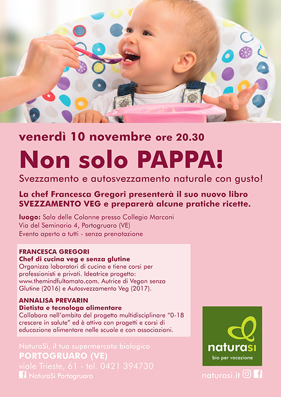 VenerdA� 10 novembre sarA? a Portogruaro per presentare il nuovo libro Svezzamento Veg, scritto insieme alla dott.ssa Tosatti, per parlare di alimentazione per l’infanzia e per illustrare qualche facile ricetta per la fase dello svezzamento.