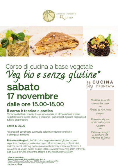 Verranno illustrati i principi per una sana cucina ed alimentazione a base vegetale e preparati i piatti indicati nella locandina: Hummus di carote e lenticchie rosse, Tortino di riso rosso speziato, Frittatina veg con carote, cavolo nero e zenzero e Panna cotta light al bicchiere con composta di frutta di stagione