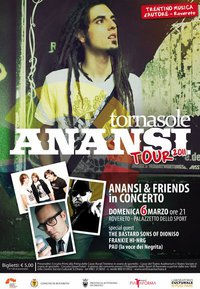 Dopo la partecipazione al Festival di Sanremo Anansi presenterA� live il suo disco Tornasole, domenica 6 marzo al Palazzetto dello Sport di Rovereto. Per l’occasione saliranno sul palco anche Frankie Hi-Nrg e The Bastard Sons of Dioniso. In chiusura DJ SET di Pau (Negrita) In Tornasole, pubblicato lo scorso 16 febbraio per Atlantic/Warner Music, c’A? anche il brano “Il Sole Dentro” con cui Anansi si A? presentato sul palco dell’Ariston. Il disco spazia dal reggae a sonoritA� r’n’b e hip hop e contaminazioni acustiche, fino ad arrivare a pezzi rock piA? spinti. Nell’album sono presenti featuring con Bunna (Africa Unite), Frankie Hi-Nrg e The Bastard Sons of Dioniso