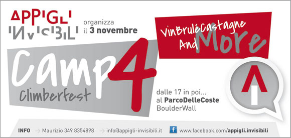 In attesa della futura struttura di arrampicata che si preannuncia tra le piA? importanti d’Italia e che sorgerA� nella zona di San Bartolomeo, a�?Appigli Invisibilia�? nasce e festeggia: a�?Camp4a�? (il nome dell’evento deriva da quello famoso in Yosemite dove i moderni arrampicatori si ritrovavano negli anni ’70 e ’80) si terrA� sabato 3 novembre dalle 17 in poi al parco alle Coste, con il tradizionale vin brulA? e castagne, minestrone dell’arrampicatore e minestrone vegano, un’occasione per avvicinarsi al mondo verticale in un clima coinvolgente.