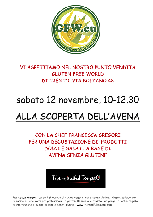 Sabato prossimo, 12 novembre, dalle ore 10 alle 12.30 sarA? a Gluten Free World, il supermercato di Trento dedicato ai prodotti senza glutine per far assaggiare dei prodotti a base di avena certificata: pane, crespelle, biscotti, etc.