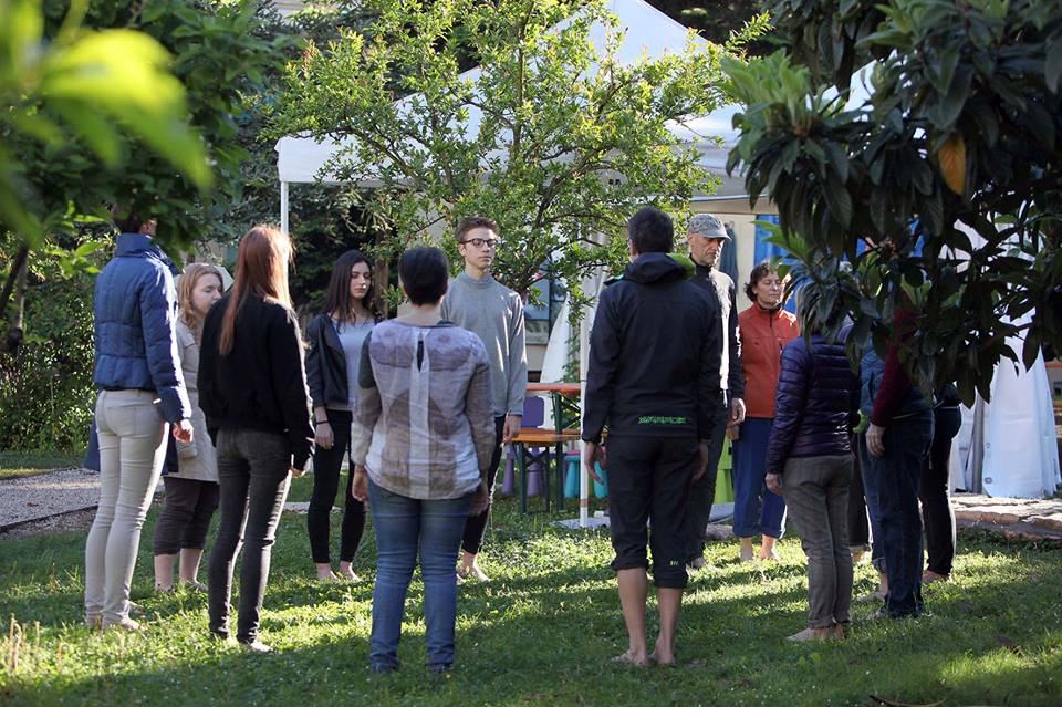 Scettico quindi mi son tolto le scarpe, e ad essere sinceri l’essere scalzi mi ha messo molto a disagio, essendo i piedi ai miei occhi molto imbarazzanti da mostrare e brutti. Il primo contatto con la terra gelida mi ha dato un brivido all’intero corpo, risvegliandolo e invigorendolo. Tremante mi son disposto in cerchio assieme agli altri, e Andrea Bianchi per prima cosa ci ha fatto fare degli esercizi di stretching insoliti, incentrati su una connessione tra i propri piedi e il prato sottostante, dove l’equilibrio e l’esercizio fisico si sposavano con una piacevole sensazione di libertA� e vicinanza alla natura. L’atmosfera creatasi di pura simbiosi con l’ambiente circostante ha donato a questo riscaldamento un’aurea di pace e tranquillitA�, con il vento che frusciava negli alberi e gli uccellini cinguettanti. Ad occhi chiusi abbiamo a�?messo le radicia�?, come ha detto lo stesso Bianchi, e ci siamo goduti quel momento di silenzio e di riflessione ancora con i piedi gelati stando fermi immobili in mezzo al prato.