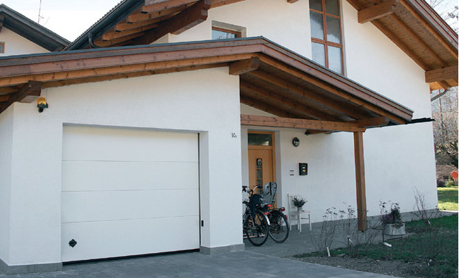 Persus, realizzato con pannelli coibentati in acciaio zincato preverniciato, A? disponibile in acciaio liscio con o senza doghe orizzontali.