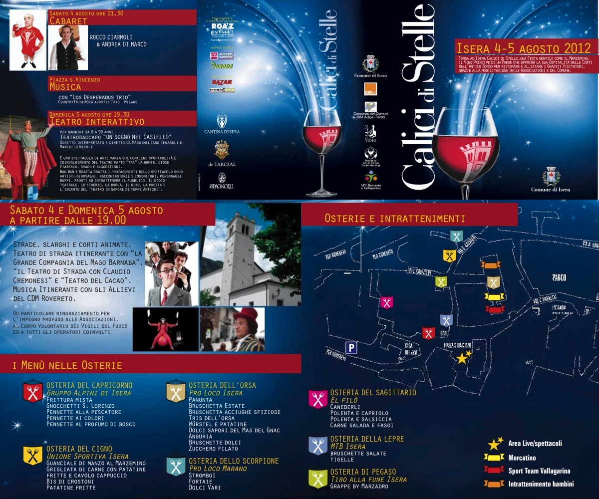 Il Marzemino torna protagonista nel centro storico di Isera il 4 e 5 agosto. a�?Calici di Stellea�? propone, accanto alle degustazioni di vino e dei piatti tradizionali nelle osterie del paese, uno spettacolo di cabaret con Andrea di Marco e Rocco Ciarmoli (meglio noto come Rokko GigolA?), il teatro interattivo per i piA? piccoli, un set acustico di musica live e teatro di Strada e musica itinerante lungo le vie del paese.