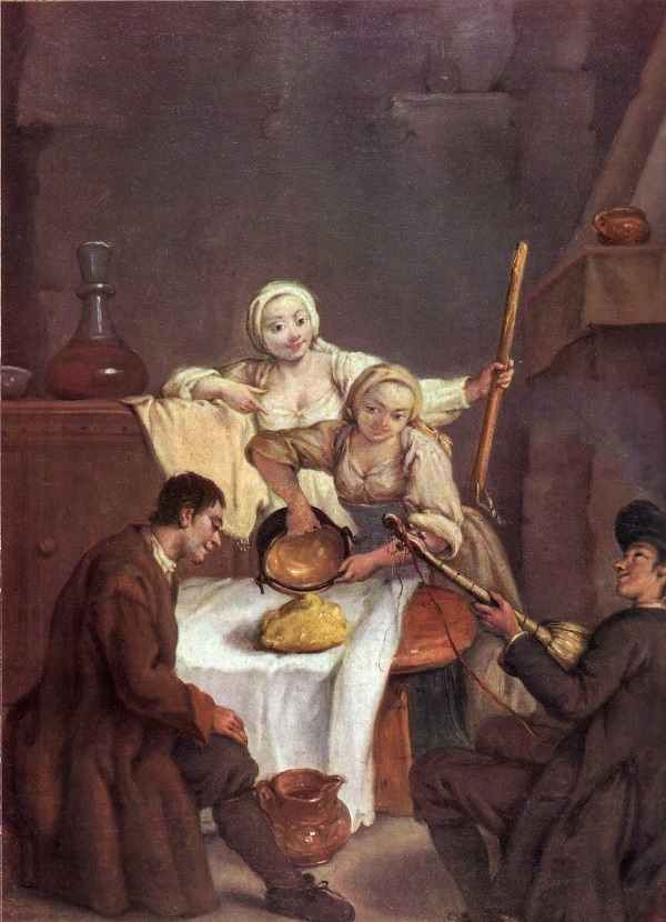 In “La Polenta”, dipinto datato 1740 circa, si possono notare tutte le caratteristiche descritte sopra; la scena A? ambientata in un interno dell’epoca, presumibilmente una cucina, e rappresenta due massaie intente a versare la polenta su una tavola apparecchiata solamente con una tovaglia bianca, alla quale siedono due uomini pronti a ricevere il frugale ma sostanzioso pasto.