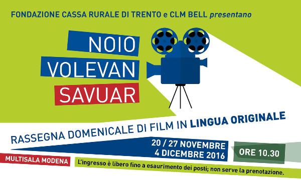 Quattro film in lingua originale in tre domeniche, dal 20 novembre al 4 dicembre. Ea�� la terza edizione di a�?Noio volevan savuara�? promossa dalla Fondazione Cassa Rurale di Trento e Clm Bell.