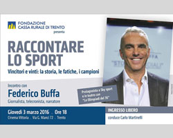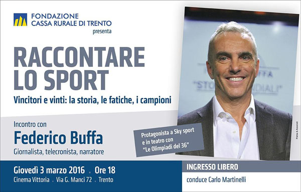 GiovedA� 3 marzo Federico Buffa sarA� a Trento, invitato dalla Fondazione Cassa Rurale di Trento, che ha organizzato un incontro – ingresso libero fino ad esaurimento dei posti – al Cinema Vittoria di via Manci, a Trento, ore 18.