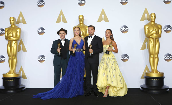 Best supporting actor Mark Rylance, "Bridge of Spies", Best actress Brie Larson, "Room", best actor Leonardo DiCaprio, "The Revenant", and best supporting actress Alicia Vikander, "The Danish Girl", pose during the 88th Academy Awards in Hollywood, California February 28, 2016. REUTERS/Mike Blake - RTS8HG0