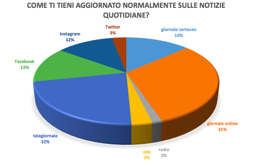 Eravamo curiosi di sapere quali fossero i media maggiormente utilizzati dai nostri coetanei e per questo abbiamo condotto una piccola indagine, senza alcun valore statistico, per farci un’idea sull’evoluzioneA�del concetto diA�informazione negli ultimi anni, a seguito della rivoluzione social.