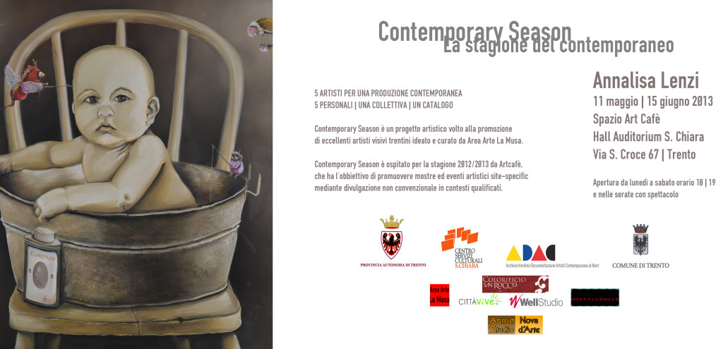 Per la stagione 2012|2013, Area Arte La Musa si presenta con l’ambizioso a�?Contemporary Season|La stagione del Contemporaneoa�?. Contemporary Season A? un progetto che nasce con l’intento di promuovere e dare visibilitA� a cinque eccellenti artisti emergenti trentini mediante una serie di esposizioni personali, una collettiva ed una pubblicazione/catalogo, il tutto presso lo spazio Art CafA?, del Centro Servizi Culturali Santa Chiara.