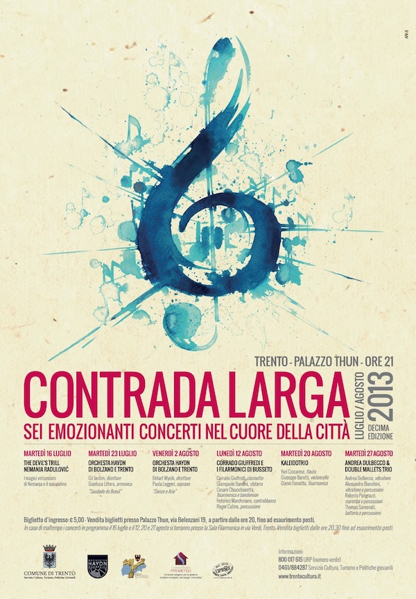 Ritorna per la decima volta a Trento la rassegna musicale CONTRADA LARGA, ormai tradizionale appuntamento estivo per la cittA� e i suoi ospiti. Una��occasione da��ascolto che la��Amministrazione comunale intende offrire gli appassionati della musica da��arte, aprendo le porte della sede municipale di Palazzo Thun in via Belenzani (la��antica Contrada Larga), dove saranno ospitati, nello splendido cortile, i sei concerti in programma. Un segnale della volontA� di rendere la��Istituzione piA? vicina al cittadino, animando la cittA� con una serie di iniziative rivolte a residenti e turisti.