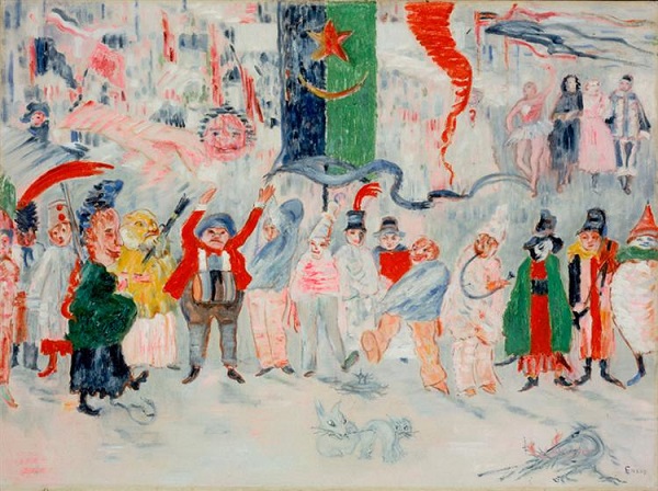 I suoi lavori sono carichi di un simbolismo dissacrante e visionario, forse un modo per “sfogare” sulla tela la sua aggressivitA�, e il fatto che raffigurasse cosA� spesso personaggi in maschera e scene carnevalesche manifesta il suo profondo legame con Ostenda e con l’attivitA� della madre.