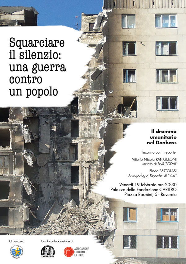 Squarciare il silenzio: una guerra contro un popolo a�� Il dramma umanitario nel DonbassA�si terrA� venerdA� 19 febbraio a Rovereto ad ore 20:30 presso la sala della Fondazione Caritro in Piazza Rosmini.