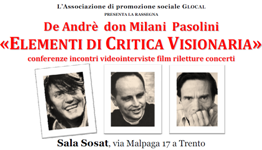 L’Associazione Glocal vi invita a prendere parte alla rassegna “Elementi di critica visionaria” incentrata su tre personaggi chiave della cultura del Novecento italiano: De AndrA?, don Milani e Pasolini. Tre personaggi molto diversi tra loro, ma con anche notevoli punti di contatto.