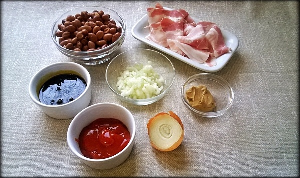 Unire tutti gli ingredienti (fagioli, ketchup, melassa, senape, cipolla e peperoncino) in una teglia, mescolare per amalgamarli bene tra loro e sistemarvi sopra le fette di pancetta.
