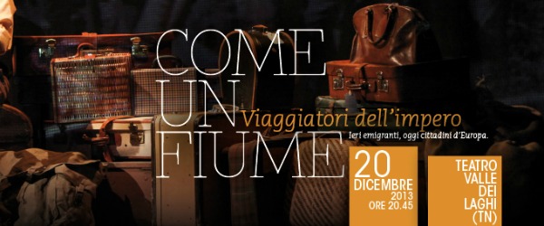 VenerdA� 20 dicembre (h. 20.45) presso il Teatro Valle dei Laghi di Vezzano (TN) andrA� in scena Come un fiume. Viaggiatori della��Impero. Ieri emigranti, oggi cittadini da��Europa, spettacolo teatrale prodotto dalla��Associazione culturale ATTI con il sostegno della��Ufficio Emigrazione della Provincia Autonoma di Trento e dedicato alla storia dei trentini emigrati nei confini della��Impero austro-ungarico.