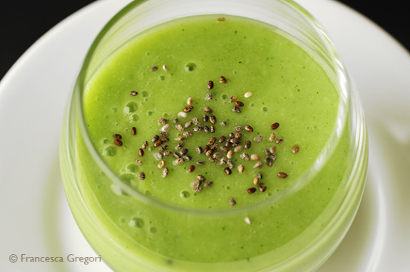 Potete servire un bel bicchiere oppure un bicchierino (vedi l’immagine qui sotto) come starter ad inizio pasto, magari con dei semini di chia.
