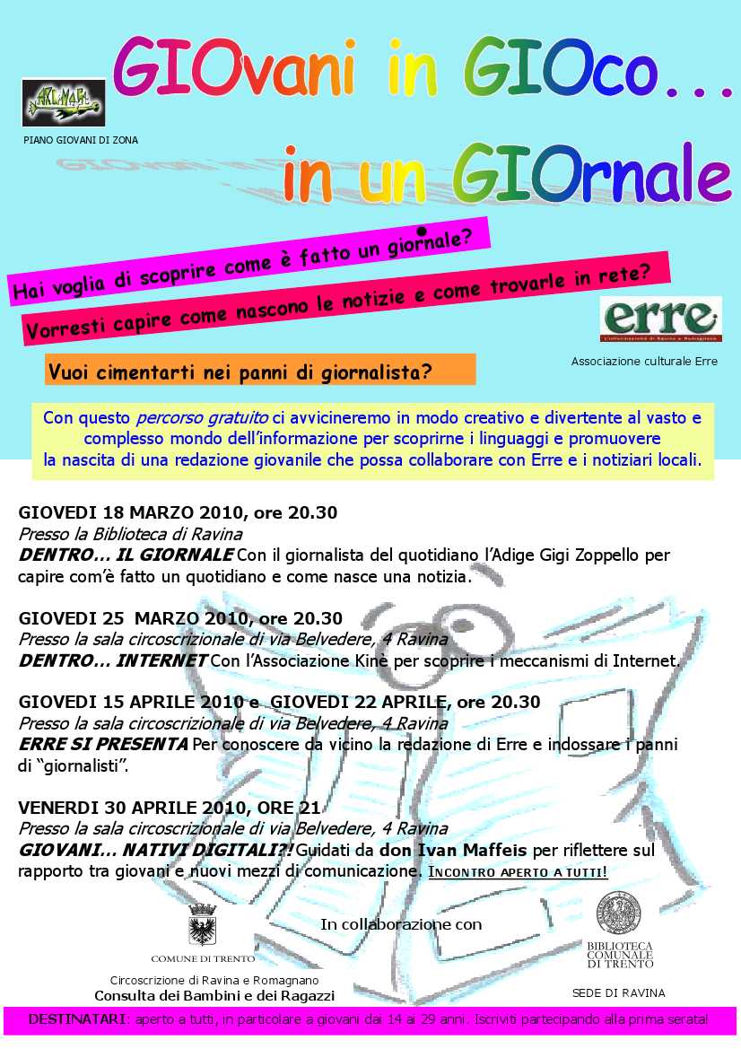 Grazie al percorso organizzato dal Comune e dalla Biblioteca Comunale di Trento si ha la possibilitA� di avvicinarsi in modo creativo e divertente al vasto e complesso mondo dell’informazione per scoprirne i linguaggi e promuovere la nascita di una redazione giovanile che possa collaborare con Erre e con i notiziari locali.
