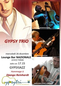 MercoledA� 26 dicembre 2012 dalle ore 17,30 al jazz manouche Lounge Bar Nazionale – LEVICO TERME, si terrA? il Concerto Natale 2012 “Hommage a Django” della formazione musicale GYPSY TRIO.