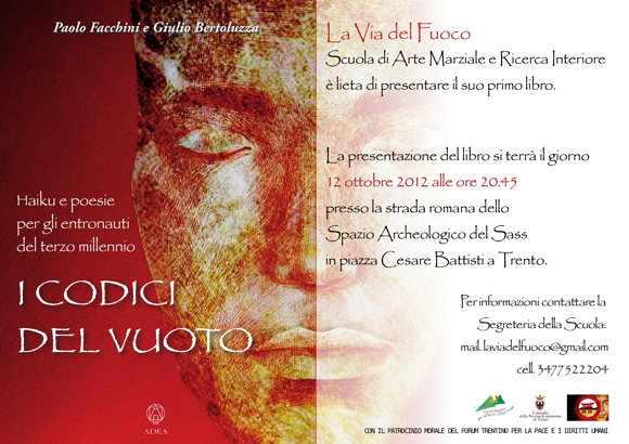 VenerdA� 12 ottobre 2012 ore 20:45 presso il suggestivo Spazio Archeologico del SASS, p.za Cesare Battisti Trento, l’associazione La Via del Fuoco invita la il pubblico alla presentazione del libro “I CODICI DEL VUOTO – Haiku e poesie per gli entronauti del terzo millennio” di Paolo Facchini e Giulio Bertoluzza.