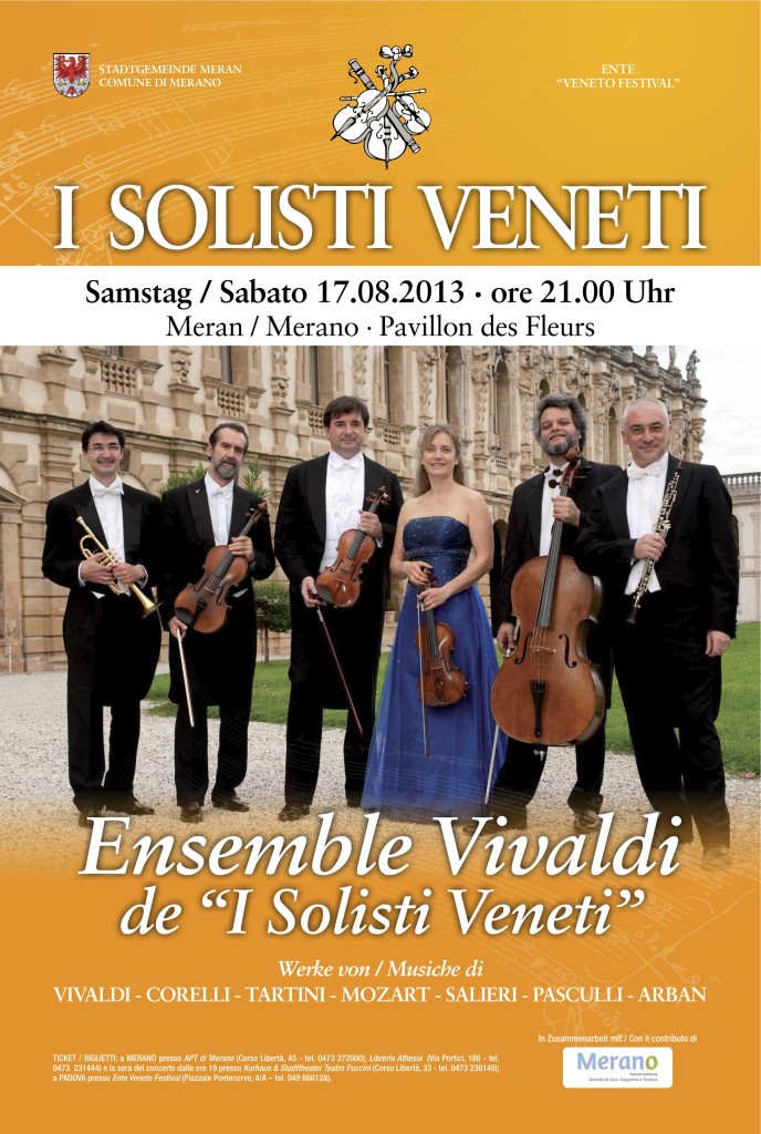 Sul palco, pronti ad affascinare ed entusiamare come sempre, musicisti di tutta eccezione: per la��occasione sarA� infatti a Merano la��a�?ENSEMBLE VIVALDIa�? de a�?I SOLISTI VENETIa�?, gruppo strumentale tradizionalmente composto dalle prime parti de a�?I Solisti Venetia�?, la��orchestra italiana piA? famosa nel mondo da ormai un cinquantennio a�� anzi di piA?, visto che questi celebri ed acclamati musicisti si apprestano a celebrare nella prossima stagione i cinquantacinque anni di attivitA� ininterrotta. Un ensemble sempre giovane e fresco nel suo contagioso entusiasmo per la musica, forte di una creativitA� che in tanti decenni non ha conosciuto flessioni a�� e che anzi, come sempre accade con i veri artisti, si A? semmai accresciuta per la grande esperienza artistica raccolta – e che spicca inconfondibile anche alla sola lettura del bel programma formulato per la serata del 17 agosto. Un omaggio alla terra natale de a�?I Solisti Venetia�?, il Veneto, sarA� il primo brillante brano in programma: il Concerto in re minore RV 127 per archi di Antonio Vivaldi, immediatamente seguito dalla��affettuosa celebrazione di una delle piA? significative ricorrenze centenarie di questa��anno 2013: tutta Europa infatti, ma soprattutto la��Italia, festeggia proprio questa��anno il trecentesimo anniversario della morte di uno dei piA? grandi musicisti della storia della musica: Arcangelo Corelli, capostipite della Scuola Musicale Romana, che la��a�?Ensemble Vivaldia�? ricorderA� eseguendone uno dei piA? popolari capolavori: la Sonata in re minore per violino e violoncello che Corelli pose a suggello della propria quinta opera a stampa modellandola come una��esaltante serie di geniali variazioni su un tema musicale di danza lenta allora molto amato e detto Follia o anche Follia da��Espagna. Il solenne Concerto in re maggiore per tromba e archi di Giuseppe Tartini sarA� il terzo brano in programma, un capolavoro che oggi porta il titolo di Concerto a�?Santa��Antonioa�?, in omaggio al Santo padovano nella cui Basilica Tartini fu Primo violino e Maestro dea�� Concerti per quasi tutta la vita. Il programma si lancerA� quindi verso gli orizzonti del grande Classicismo mitteleuropeo – e Merano fu a lungo parte della��Impero Autroungarico – dapprima con Wolfgang Amadeus Mozart, del quale verrA� eseguito il vivace Divertimento per archi in re maggiore K 136, e subito dopo con una��autentica raritA� musicale: l’Andante e variazioni per clarinetto e archi che Girolamo Salieri a�� nipote del piA? celebre Antonio Salieri a�� scrisse elaborando un tema tratto dalla��Opera Ermione di Rossini. E proprio questo brano elegante inaugurerA� la��esaltante parte finale del concerto, segnata da quella��impareggiabile virtuosismo strumentale che da sempre A? il fiore alla��occhiello della��a�?Ensemble Vivaldia�?. Saranno cosA� le agilitA� mozzafiato dei Simpatici ricordi della a�?Traviataa�? per oboe e archi di Antonino Pasculli a�� il piA? grande virtuoso di oboe del secondo Ottocento italiano a�� e le acrobatiche evoluzioni solistiche delle Variazioni sul a�?Carnevale di Veneziaa�? per tromba e archi di Jean Baptiste Arban a concludere il programma di un autentico evento di arte e cultura ma anche di grande spettacolo che si annuncia giA� da ora imperdibile e destinato a restare a lungo nella memoria.