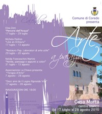 La proposta culturale estiva si arricchisce e si rinnova con la��esordio di a�?Arte a Palazzoa�?, una rassegna di esposizioni artistiche in programma nei mesi di luglio e agosto 2010. Cornice di questa iniziativa promossa dal comune di Coredo sono gli spazi espositivi di Casa Marta, palazzo signorile tra i piA? caratteristici della��intera vallata e fiore alla��occhiello tra gli edifici storici della��altipiano.