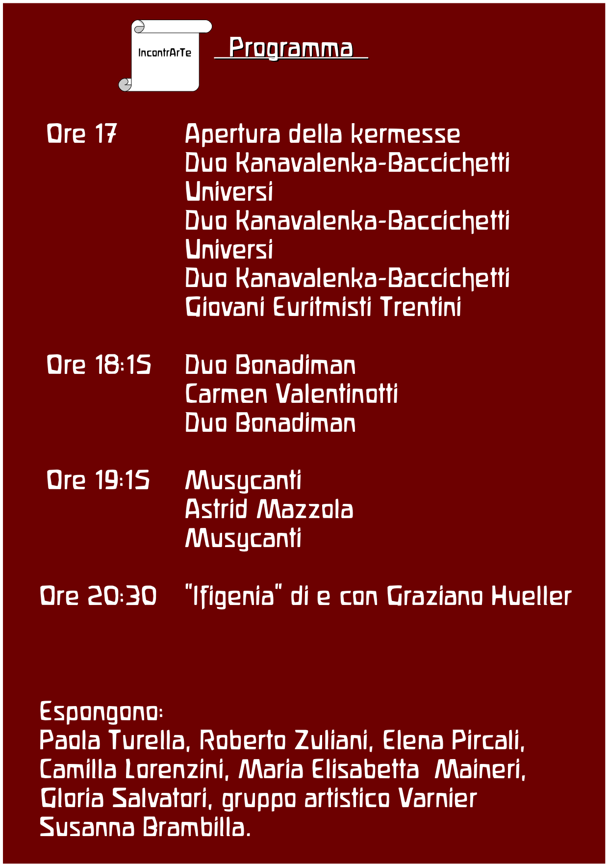 In un unico contenitore scultura, pittura, fotografia, teatro, poesia, prosa, euritmia, musica con gli artisti Paola Turella, Roberto Zuliani, Camilla Lorenzini, Maria Elisabetta Maineri, Elena Pircali, gruppo poesia Universi, gruppo di pittura Antonia Varnier, Gloria Salvatori, Giovani euritmisti trentini, Astrid Mazzola, Carmen Valentinotti, duo Bonadiman, duo Kanavalenka-Baccichetti, gruppo Musycanti, Graziano Hueller.