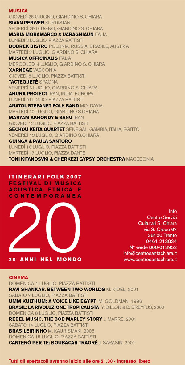 L’ultimo capitolo A? un approfondimento non scontato sui balcani: l’interessante viaggio da Faenza fino alle pianure iraniane di un gruppo di casa nostra “Musica Officinalis“; l’incontro con la tradizione della Moldavia attraverso il grande violista Anatol Stefanet; ed infine la succosa anteprima nazionale del concerto di Toni Kitanovski e Cherkezi Gypsy Orchestra, macedoni, che ci regaleranno addirittura due esibizioni, la seconda in piazza Dante, in collaborazione con la Circoscrizione centro storico, aprirA� Trento Estate 2007. E poi i film per rivedere le storie di Ravi Shankar e Bob Marley, per parlare del Brasile della rivoluzione tropicalista e del choro, mentre dall’Africa arrivano un profilo della piA? grande voce egiziana Uhm Khultum e del chitarrista cantante maliano Boubacar TraorA?.