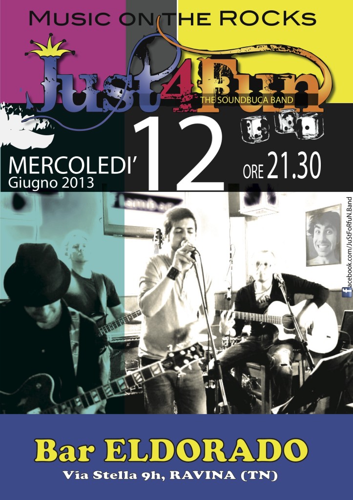 Ecco che “Eldorado Music Live” prosegue nel proporre i sui appuntamenti, rigorosamente live, del mercoledA� in quel nuovo spazio individuato presso il Disco Pub Eldorado di Ravina (TN): progetto che per mercoledA� 12 Giugno vedrA� sul palco l’imperdibile ed imprevedibile band dei “JUST4FUN”“.