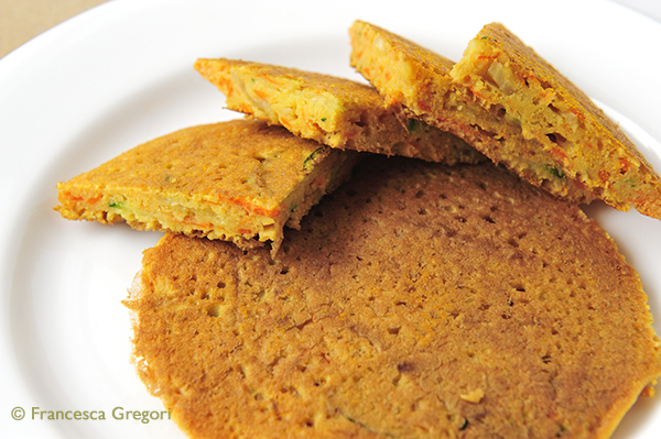 Come avrete capito mi piacciono le porzioni piccole, per un fatto estetico ma anche perchA? consentono di gestire meglio le dosi a seconda dei commensali.Quindi anche in questo caso vi propongo delle mini frittate, preparate con la farina di ceci anzichA? con l’uovo. La curcuma conferisce un colore ambrato, le rende leggermente speziate e particolarmente digeribili (rimando al commento dellaA�Dott.ssa Lamprech per tutte le proprietA� di questa spezia). Oggi le ho servite con della quinoa ed un’insalata mista. Per i piA? piccoli: aggiungete un po’ di finocchio, che A? fresco e dolce e piace ai bambini, evitate il pepe e non esagerate con la curcuma.