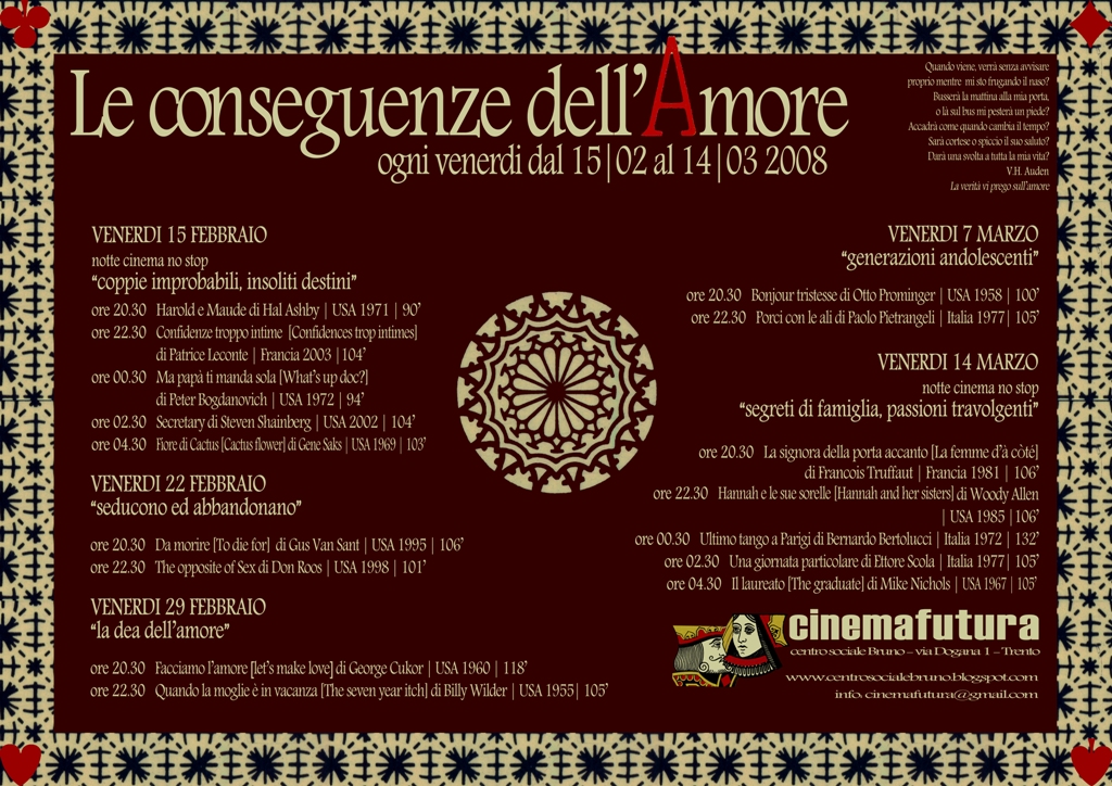 Le conseguenze della��Amore Nuovo serata di cinema al Centro Sociale Bruno dove “Cinema Futura” organizza “Le conseguenze dell’amore, cinque serate di cineforum, ognuna con un suo titolo e tema specifico: questa sera, venerdA� 7 marzo, A? dedicata alle generazioni adolescenti.. “.