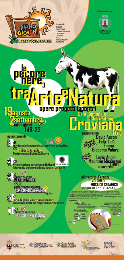 locandina-lepecorenere.jpgLe Pecore Nere 3 – Tra Arte e Natura è un progetto che nasce dall’esperienza maturata dal gruppo artistico “Le Pecore Nereâ€?, in collaborazione con i progetti dei Piano Giovani – Bassa Val di Sole delle Politiche Giovanili della Provincia Autonoma di Trento e il Comune di Croviana.