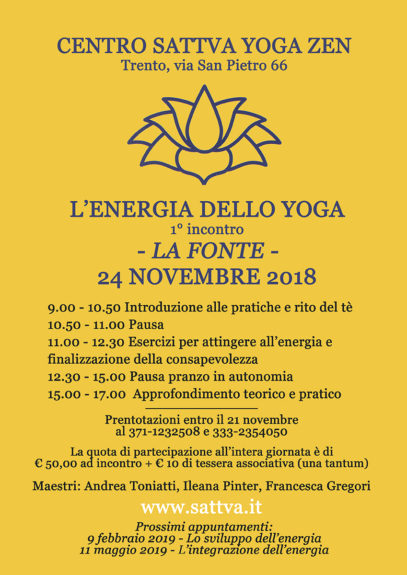 Il Centro Sattva Yoga e Zen di Trento organizza un ciclo di tre incontri dedicati all’ “ENERGIA DELLO YOGA”.