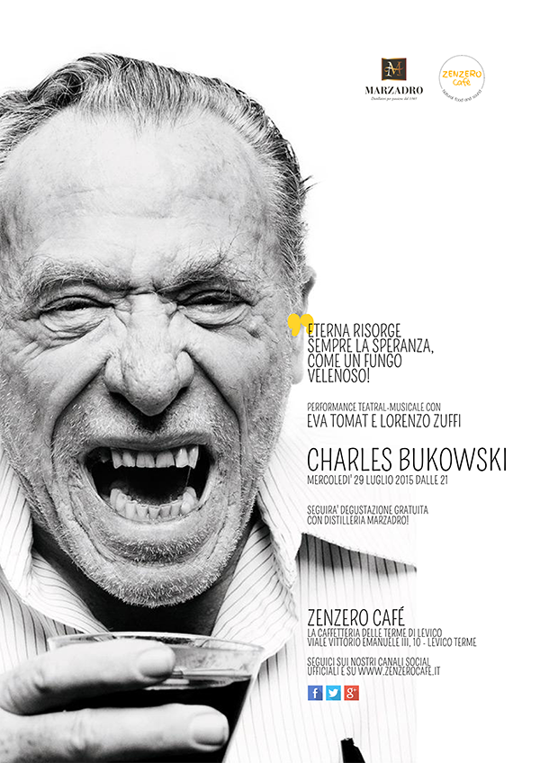 MercoledA� 29 luglio 2015 dalle 21 lo Zenzero CafA�, la caffetteria delle terme di Levico Terme, presenta CHARLES BUKOWSKI, una performance teatral-musicale di e con Eva Tomat e Lorenzo Zuffi.