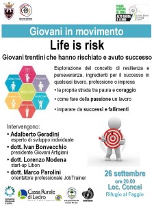 Workshop a�?Life is risk a�� Giovani trentini che hanno rischiato e avuto successoa�� promosso dal Piano Giovani di Zona Alto Garda e Ledro in collaborazione con la Cassa Rurale di Ledro, l’Assessorato alle politiche giovanili della Provincia Autonoma di Trento, la ComunitA� di Valle Alto Garda e Ledro e JobTrainer, con il patrocinio del Comune di Ledro.
