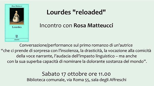 LOURDES RELODED – CONVERSAZIONE CON LA SCRITTRICE ROSA MATTEUCCI – SABATO 17 OTTOBRE ORE 11 – TRENTO – BIBLIOTECA COMUNALE DI VIA ROMA 11, SALA DEGLI AFFRESCHI
