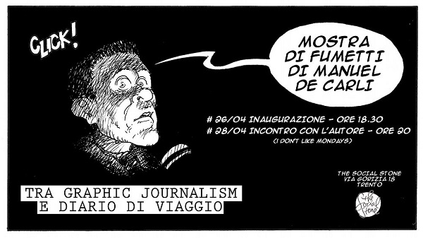 Tornano gli appuntamenti con i libri al Community CafA? di via Gorizia 18, a Trento. Protagonista Manuel De Carli, illustratore e vignettista di origini trentine, da anni trapiantato a Roma. Sabato 26, proprio al Social Stone, verrA� inaugurata una mostra dei suoi disegni mentre lunedA� 28 aprile Manuel De Carli racconterA� il suo percorso creativo ed artistico che la��ha portato, in questi anni, a realizzare importanti lavori editoriali e a percorrere un ricco e variegato cammino artistico e creativo.A�La registrazione video della��incontro sarA� disponibile – cosA� come le 20 conversazioni sui libri fin qui tenute al The Social Stone a�� sui sitiA�www.keecomm.netA�eA�www.thesocialstone.netA�da poco proposti in una nuova veste grafica.