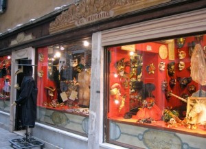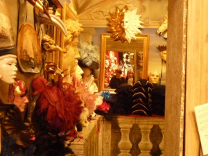 Magia e sensazione di sospensione tra maschere d’oro, piumate, colorate. La gentilissima commessa sembra anch’essa una figurina da sogno, sorridente, eterea. Non entra nessuno mentre noi ci aggiriamo quasi “perdendoci” tra i volti di Arlecchino, dame veneziane, gatti neri.